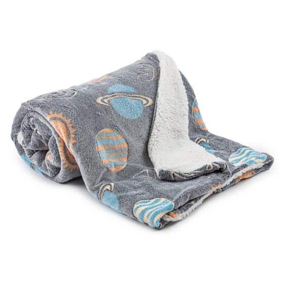 Do hebučkej baránkovej deky sa s radosťou zababuší každý člen rodiny. Je ideálnym spoločníkom pre jesennú a zimnú relaxáciu pri obľúbenom filme, s knižkou alebo napríklad s lahodnou šálkou čaju. Originálny vesmírny vzor s planétami, slniečkom a raketami na sivom podklade navyše v tme svieti, čo poteší nielen deti, ale všetkých dobrodruhov s hravou dušou. Deka má z jednej strany úžasne jemný mikroflanel a z druhej strany huňatého baránka, ktorý doslova pozýva k zababušeniu. Baránok z mäkučkého mikrovlákna je veľmi jemný, hebký a nadýchaný. Je dokonale hrejivý, takže si ho zamilujú aj najväčší zmrzlíci. Zahreje rovnako spoľahlivo ako pravá vlna s tým rozdielom, že neláka roztoče. Je tak skvelou voľbou pre alergikov a bude hýčkať aj citlivú pokožku. Deka je vyrobená špeciálnou metódou, pri ktorej je do vzoru pridané fluorescenčné vlákno, ktoré po nasvietení svieti.Deka má všetky potrebné atesty a spĺňa všetky požiadavky na zdravotnú nezávadnosť. Stačí ju ponechať cez deň na priamom slnečnom svetle alebo pod vnútorným osvetlením. Deka sa prirodzene „nabije“, aby večer mohla žiariť.Čím bude svetlo intenzívnejšie, tým viac a dlhšie bude produkt v tme svietiť. Odporúčame nechať na svetle „nasvietiť“ čo najdlhšie, minimálne však 10 minút.Gramáž: vrchná strana 240 gsm, spodná baránková strana 220 gsm