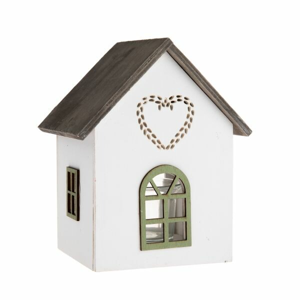 Drevený svietnik so skleneným domčekom so srdcom,15 cm, zelenýVytvorte čarovnú vianočnú atmosféru s týmto dreveným svietnikom v tvare domčeka. Domček má biele steny a zelenú strechu, veľké okno vpredu a po jednom okne na každej strane. Na štíte domčeka je veľké srdce.Vnútri domčeka je sklenený svietnik, prístupný zo zadnej strany, do ktorého môžete bezpečne a ľahko umiestniť čajovú sviečku alebo LED sviečku. Kompaktný dizajn a detailné spracovanie z neho robia ideálnu dekoráciu na stôl, parapet alebo poličku.