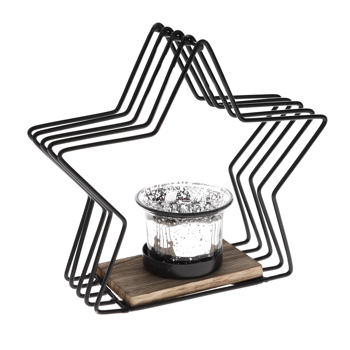 Zaujímavý svietnik je tvorený z piatich vzájomne prepojených tvarov hviezdy. Kalíšok na sviečku je ozdobený blýskavými flitrami.